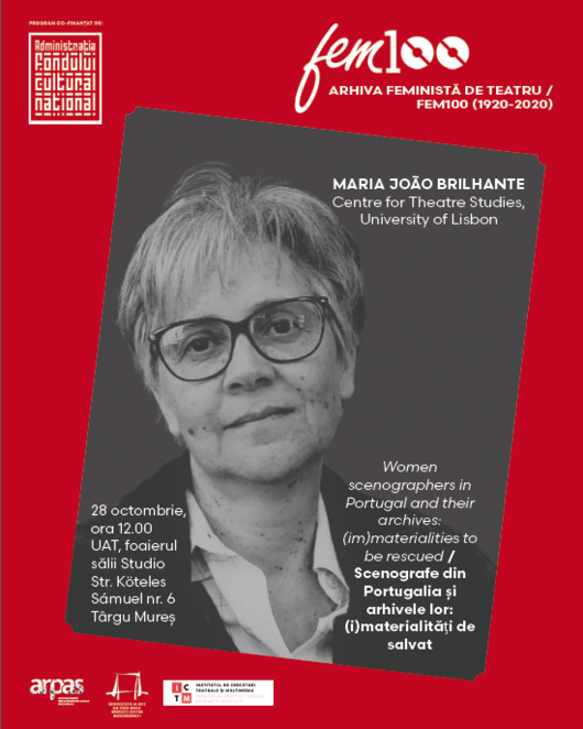 On Tuesday, October 28, 2025, at 12:00 p.m., in the foyer of the Studio Hall of the University of Arts in Târgu Mureș, 6 Köteles Sámuel Street, as part of the Feminist Theater Archive / FEM100 (1920-2020) program, the conference "Women scenographers in Portugal and their archives: (im)materialities to be rescued" will be held, presented by researcher MARIA JOÃO BRILHANTE from the Centre for Theatre Studies, University of Lisbon.