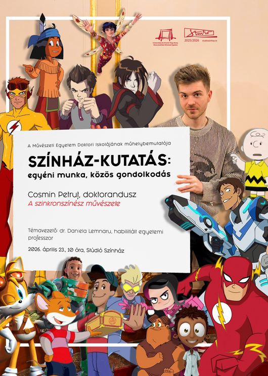 2026. április 23-án, 10 órától Cosmin Petruț doktorandusz előadásával folytatódik az MME Doktori Iskolája által meghirdetett Színház-kutatás: egyéni munka, közös gondolkodás című előadássorozat, amely nyilvános műhelymunkára hívja az érdeklődőket.