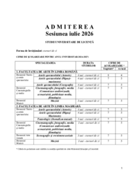 ADMITEREA Sesiunea iulie 2026 STUDII UNIVERSITARE DE LICENȚĂ Forma de învățământ: cursuri de zi CIFRE DE ŞCOLARIZARE PENTRU ANUL UNIVERSITAR 2026-2027: SPECIALIZAREA DURATA STUDIILOR 1. FACULTATEA…