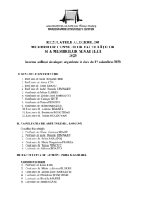 UNIVERSITATEA DE ARTE DIN TÂRGU–MUREȘ MAROSVÁSÁRHELYI MŰVÉSZETI EGYETEM REZULATELE ALEGERILOR MEMBRILOR CONSILIILOR FACULTĂȚILOR ȘI A MEMBRILOR SENATULUI 2023 în urma ședinței de alegeri organizate…