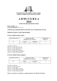UNIVERSITATEA DE ARTE DIN TÂRGU–MUREȘ MAROSVÁSÁRHELYI MŰVÉSZETI EGYETEM ADMITEREA 2024 STUDII UNIVERSITARE DE DOCTORAT Durata studiilor: 4 ani Forma de învățământ: cursuri de zi CIFRE DE ŞCOLARIZARE…