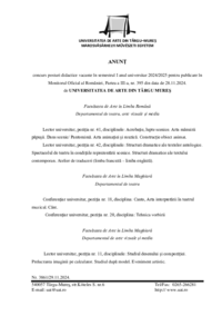 UNIVERSITATEA DE ARTE DIN TÂRGU–MUREȘ MAROSVÁSÁRHELYI MŰVÉSZETI EGYETEM ANUNȚ concurs posturi didactice vacante în semestrul I anul universitar 2024/2025 pentru publicare în Monitorul Oficial al…