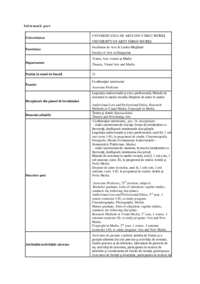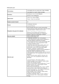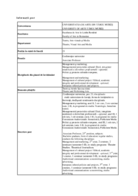 In fo r ma ți i po st Universitatea Facultatea Departament Poziția în statul de funcții Funcție Disciplinele din planul de învățământ Domeniu ştiinţific Descriere post UNIVERSITATEA DE ARTE…