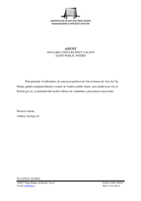 UNIVERSITATEA DE ARTE DIN TÂRGU–MUREȘ MAROSVÁSÁRHELYI MŰVÉSZETI EGYETEM ANUNȚ ANULARE CONCURS POST VACANT AUDIT PUBLIC INTERN Prin prezenta vă informăm, că concursul publicat de Universitatea de…