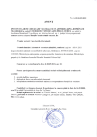 Nr. 2428101.09.2022 ANUNT INSTITUTULUI DE CERCETARI TEATRALE $I MULTIMEDIA LINIA ROMANA SI MAGHIARA in cadrul UNIVERSITATATII DE ARTE rinCu-tuURES, cu sediul in localitatea Municipiul Tirgu-Mures,…