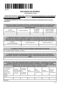 2410003 DECLARAŢIE DE INTERESE Anual, până la 15 iunie Subsemnatul Sabadoș V. Sabin, având funcţia de Președinte de Senat la Universitatea De Arte Din Targu Mures, CNP ************* , domiciliul…