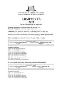 UNIVERSITATEA DE ARTE DIN TÂRGU MUREȘ MAROSVÁSÁRHELYI MŰVÉSZETI EGYETEM AD MI T ER E A 2025 STUDII UNIVERSITARE DE DOCTORAT Durata programului de studii universitare de doctorat: 4 ani Forma de…