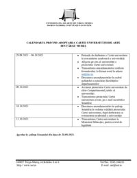 UNIVERSITATEA DE ARTE DIN TÂRGU–MUREŞ MAROSVÁSÁRHELYI MŰVÉSZETI EGYETEM CALENDARUL PRIVIND ADOPTAREA CARTEI UNIVERSITĂȚII DE ARTE DIN TÂRGU MUREȘ 29.09.2023 - 06.10.2023     09.10.2023   …