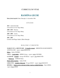 CURRICULUM VITAE RAMÓNA GECSE Data și locul nașterii: Sântu Gheorghe, 16. decembrie 1986. STUDII 2012 – Şcoala doctorală Universitatea de Arte Târgu-Mureş 2008 - 2010 – Masterat Universitatea de…