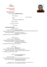 A ceastă imagine nu se poate afișa. Curriculum vitae Europass Informaţii personale Nume / Prenume CRISTACHE, Niculae Adresa România Telefon Mobil: 0743.203.926 Fax E-mail Cetăţenia Data naşterii…