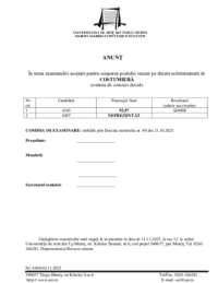 UNIVERSITATEA DE ARTE DIN TÂRGU–MUREŞ MAROSVÁSÁRHELYI MŰVÉSZETI EGYETEM ANUNȚ În urma examenului susținut pentru ocuparea postului vacant pe durată nedeterminată de COSTUMIERĂ comisia de concurs…