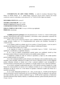 ANUNȚ UNIVERSITATEA DE ARTE TÂRGU MUREȘ, cu sediul în localitatea Municipiul Târgu Mureș, str. Köteles Sámuel, nr. 6, judeţul Mureș, organizează concurs pentru ocuparea unei funcții contractual…