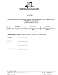UNIVERSITATEA DE ARTE DIN TÂRGU–MUREŞ MAROSVÁSÁRHELYI MŰVÉSZETI EGYETEM ANUNȚ În urma examenului susținut pentru ocuparea postului vacant pe durată nedeterminată de AUDIT PUBLIC INTERN comisia de…