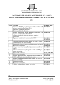 UNIVERSITATEA DE ARTE DIN TÂRGU–MUREȘ MAROSVÁSÁRHELYI MŰVÉSZETI EGYETEM CALENDARUL DE ALEGERE A MEMBRILOR DIN CADRUL CONSILIULUI PENTRU STUDIILE UNIVERSITARE DE DOCTORAT 2024 Nr.crt. Activitate…